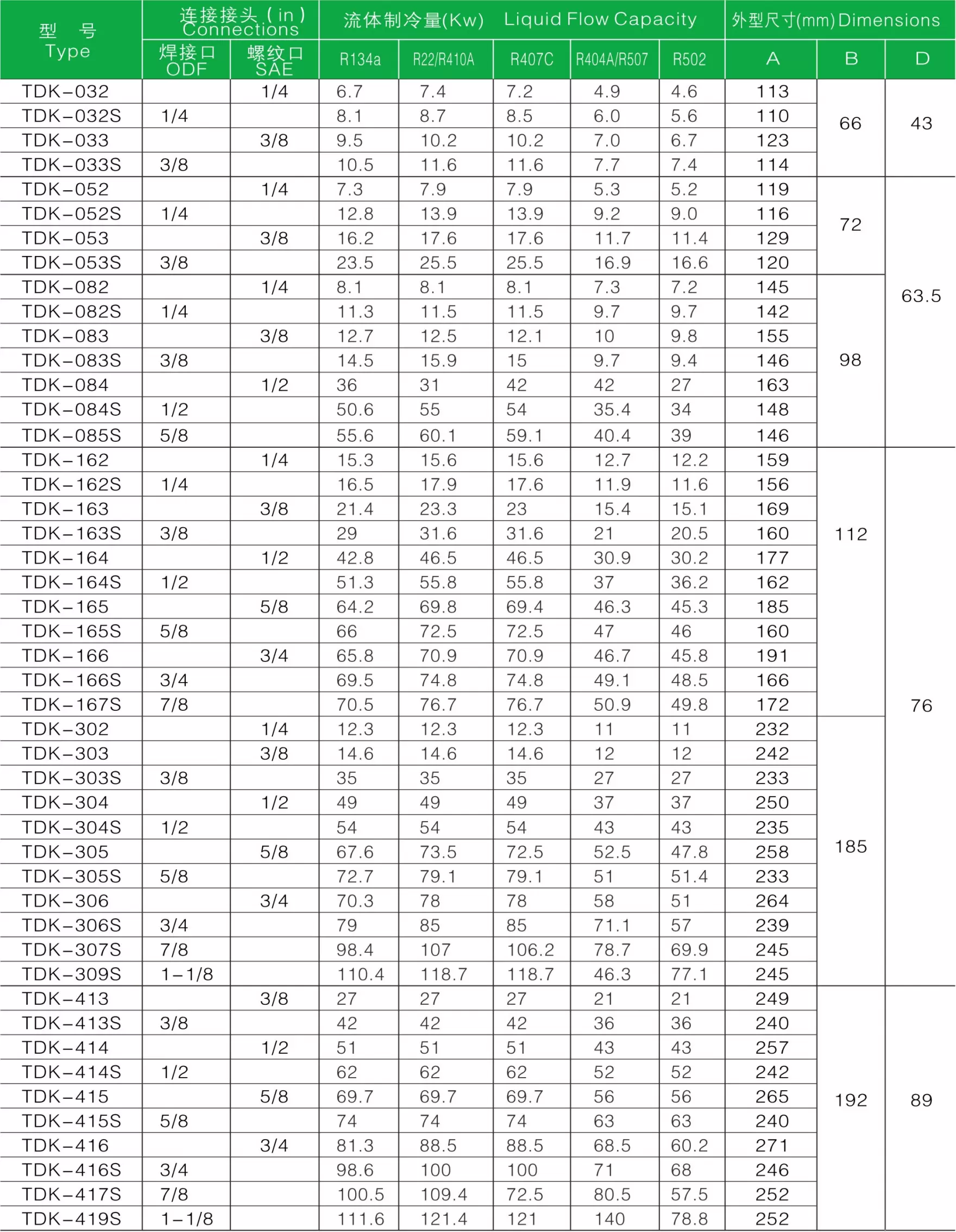 TDK液管用干燥过滤器采用固体实芯设计,利用特殊的混合物干燥剂提供了优良的过滤能力,从而保证制冷系统不受有害液体和固体污染物的污染。