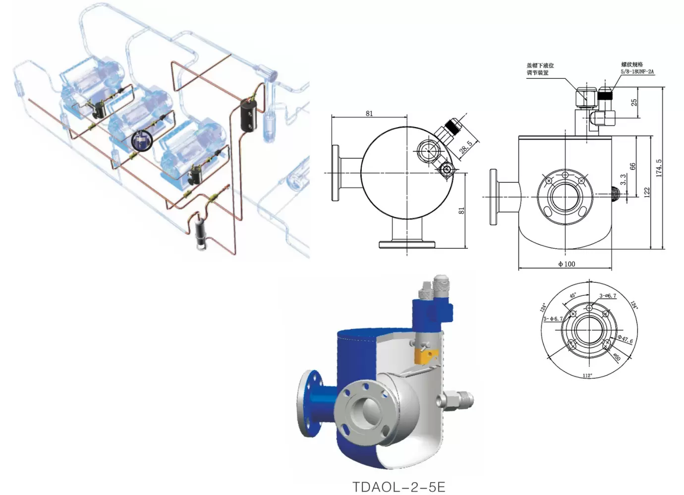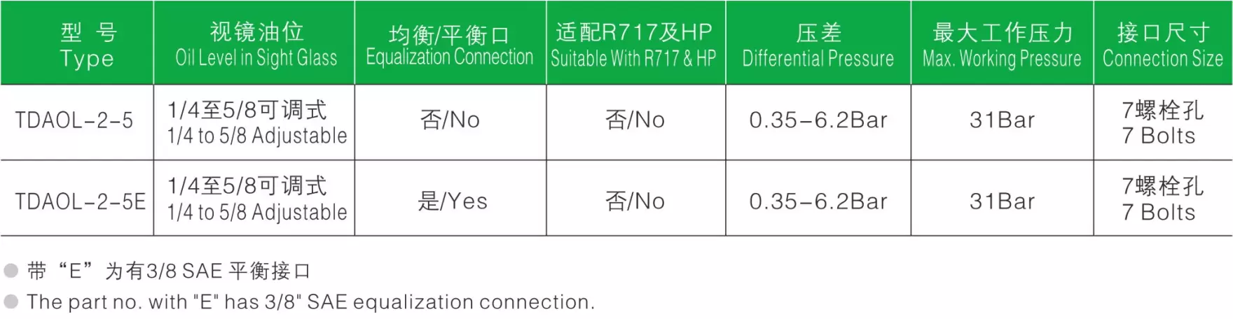 TEIDARTDAOL-2-5可调式油位控制器使得压缩机曲轴箱内的油位维持在1/4英寸的观察镜与5/8英寸的观察镜之间的任何油位。TDAOL-2-5可调式油位控制器在5磅平方英寸与90磅/平方英寸之间的任何压差都能维持着油位。如果曲轴箱内的油位过高或过低,可以通过旋转调整器顶部的可调螺钉来调节油位。此操作可以在系统运行时进行。我们所特有的设计避免了为调节调整器而关闭系统并断开供油管道的状况。